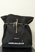 A very spacious and convenient backpack bag. It has long handles for wearing on the shoulders. It can be drawn closed at the top with a drawstring, like a pouch. It features one outside pocket adorned with a design and inscription that adds to its design. The material used is natural cotton. The bag is eco-friendly, lightweight, and easy to maintain. The product's dimensions are 42 by 40 cm. It is capacious enough to hold many items and sturdy enough to support their weight. The handles are securely attached to the main fabric. It's perfect for walks and shopping trips.