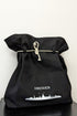 A very spacious and convenient backpack bag. It has long handles for wearing on the shoulders. It can be drawn closed at the top with a drawstring, like a pouch. It features one outside pocket adorned with a design and inscription that adds to its design. The material used is natural cotton. The bag is eco-friendly, lightweight, and easy to maintain. The product's dimensions are 42 by 40 cm. It is capacious enough to hold many items and sturdy enough to support their weight. The handles are securely attached to the main fabric. It's perfect for walks and shopping trips.