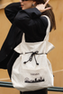A very spacious and convenient backpack bag. It has long handles for wearing on the shoulders. It can be drawn closed at the top with a drawstring, like a pouch. It features one outside pocket adorned with a design and inscription that adds to its design. The material used is natural cotton. The bag is eco-friendly, lightweight, and easy to maintain. The product's dimensions are 42 by 40 cm. It is capacious enough to hold many items and sturdy enough to support their weight. The handles are securely attached to the main fabric. It's perfect for walks and shopping trips.